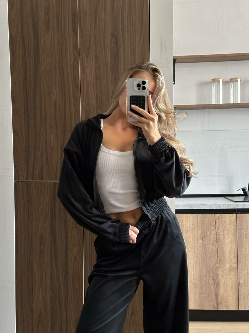 Велюровий костюм, який складається і вкороченого худорлявого з капюшоном і штанів з широкою гумкою на талії. Колір чорний.