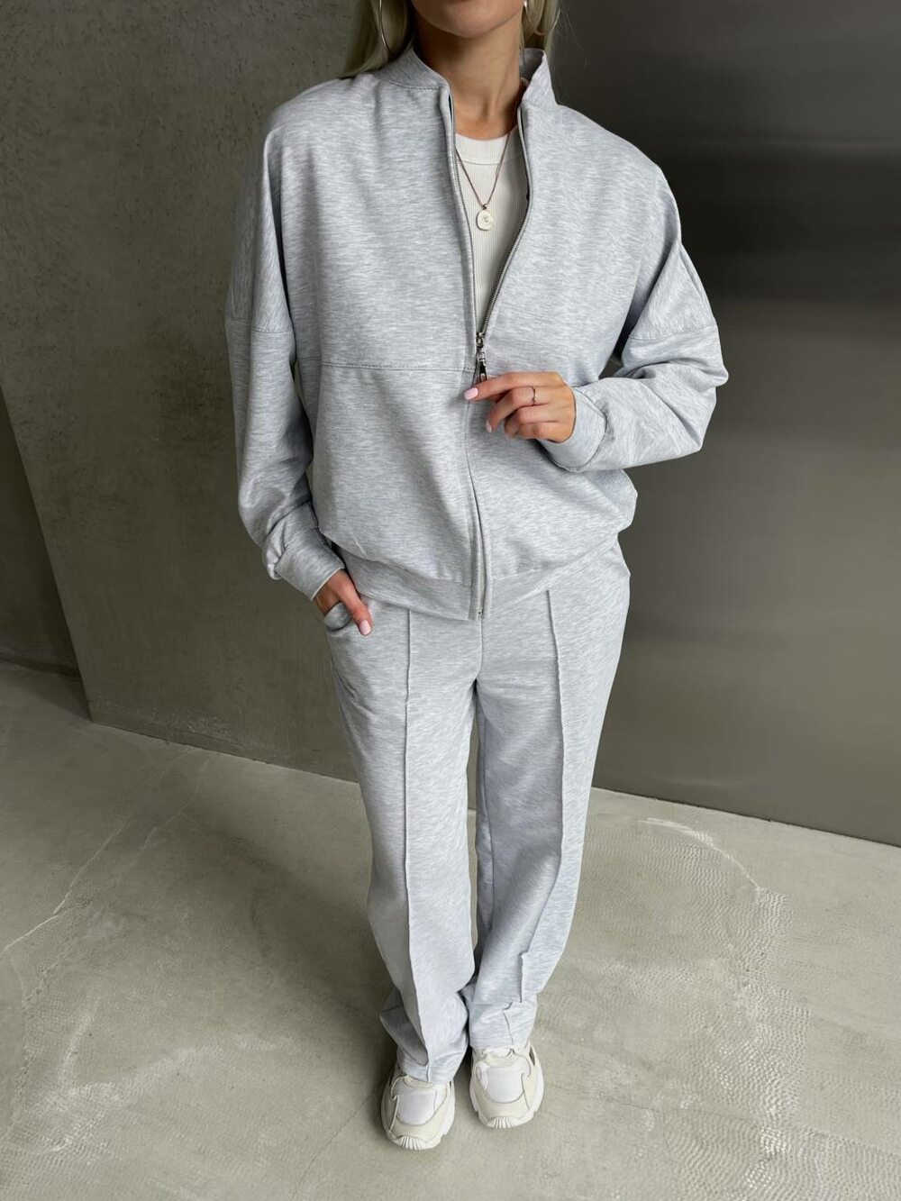 Костюм складається з прямих штанів з еластичним поясом та декоративними стрілками. Верх – вільна куртка на блискавці з довгими рукавами. Обидва елементи виконані в єдиному мінімалістичному стилі м'якого матеріалу. Тканина дуже м'яка і приємна на дотик, не скочується! Фурнітура якісна. Колір сірий.