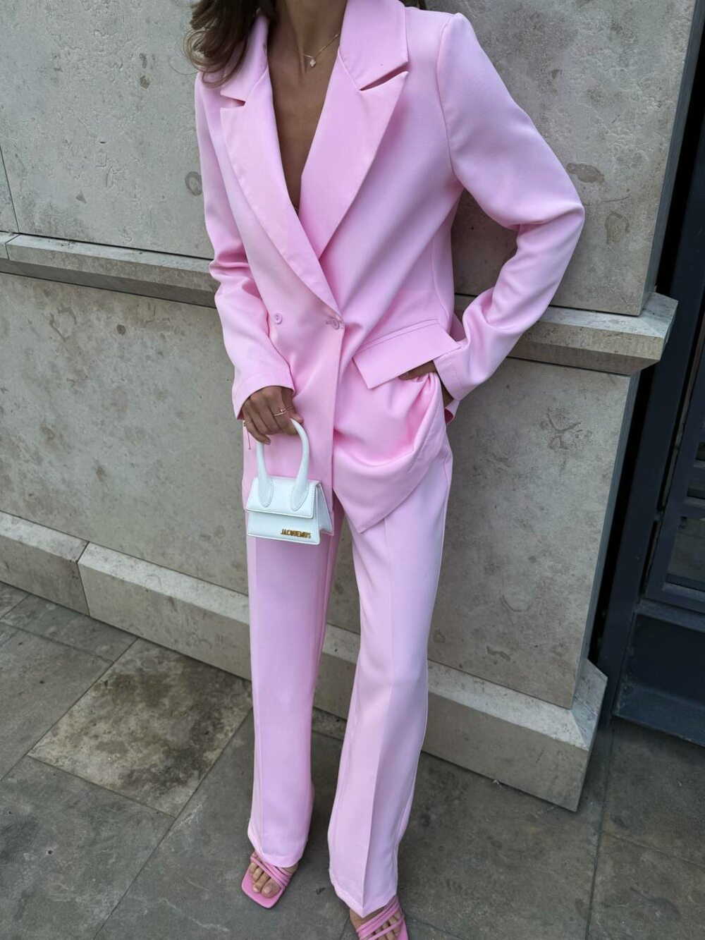 Костюм двійка складається з піджака та штанів, колір рожевий