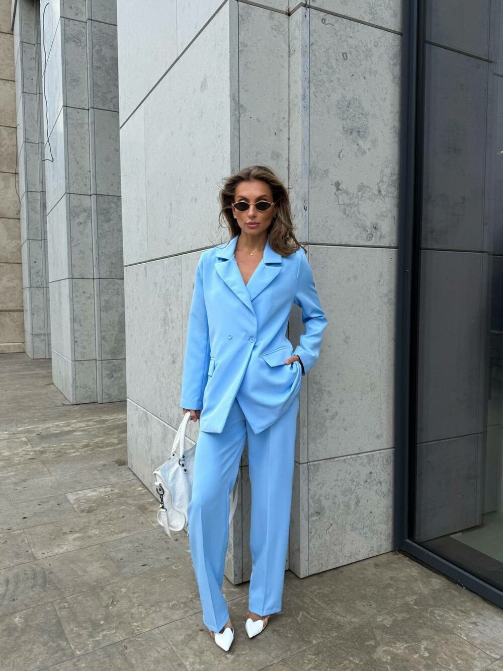 Костюм двійка складається з піджака та штанів, колір блакитний