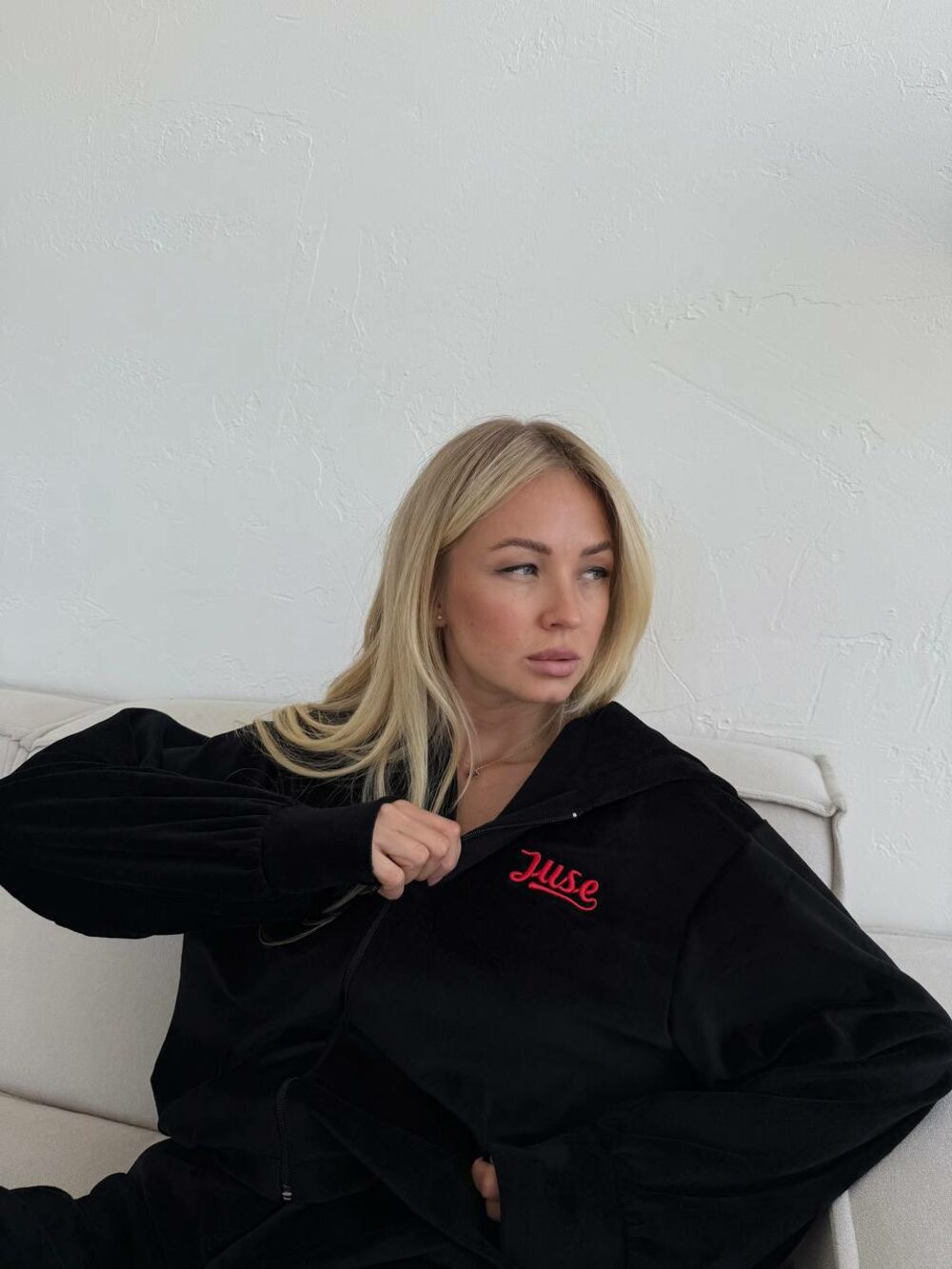 Костюм виконаний з м'якого і приємного на дотик велюру. Верх — кофта прямого крою на блискавці з капюшоном, довгими рукавами та невеликим логотипом. Низ - прямі штани на резинці зі шнурком для регулювання посадки, що створюють комфортний та затишний образ. Колір чорний.