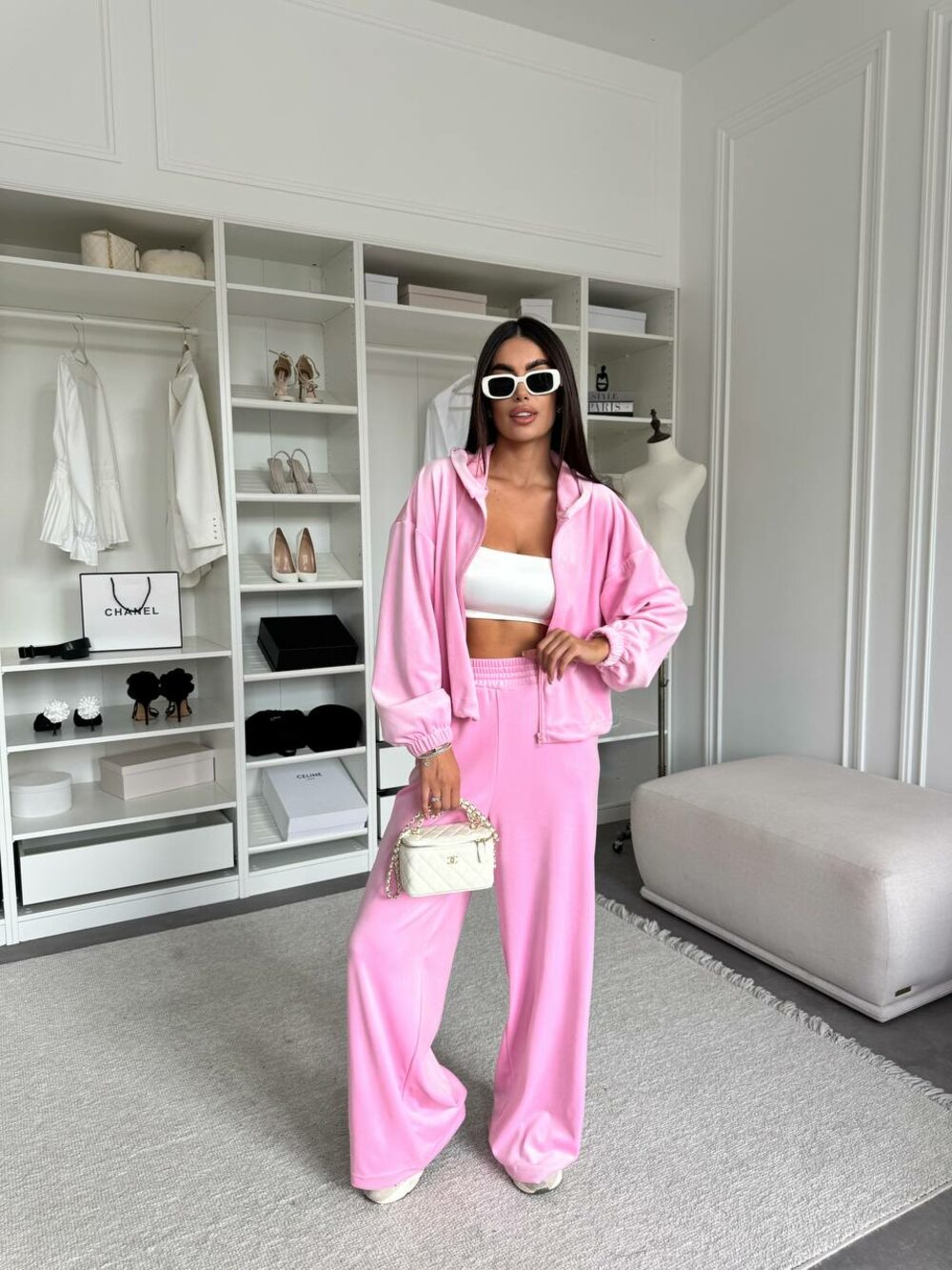 Велюровий костюм складається з кофти та штанів вільного крою. Кофта з капюшоном з боків регулюється зав'язками. Штани прямого вільного крою з гумкою на талії та кишенями з боків. Колір рожевий.