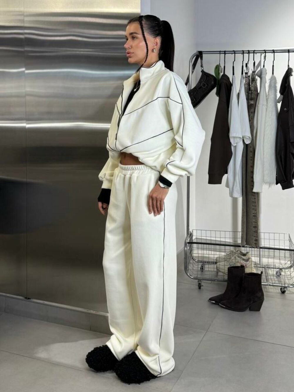 Базовий костюм із двостороннього флісу складається з кофти та штанів. Кофта вільного крою на модніні оброблена акцентними смужками. Штани прямі з акцентними смужками з боків, з гумкою на талії та кишенями з боків. Колір молочний.