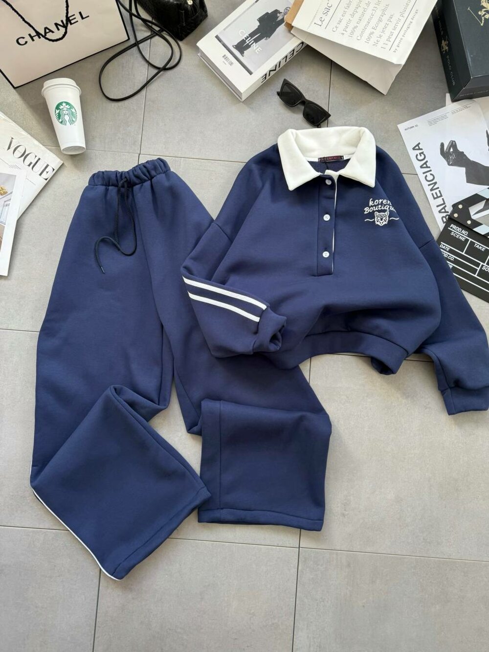 Костюм на флісі складається з кофти та штанів. Кофта застібається на гудзики на грудях і має відкладний комір. Штани з гумкою на талії та внизу. Колір синій.