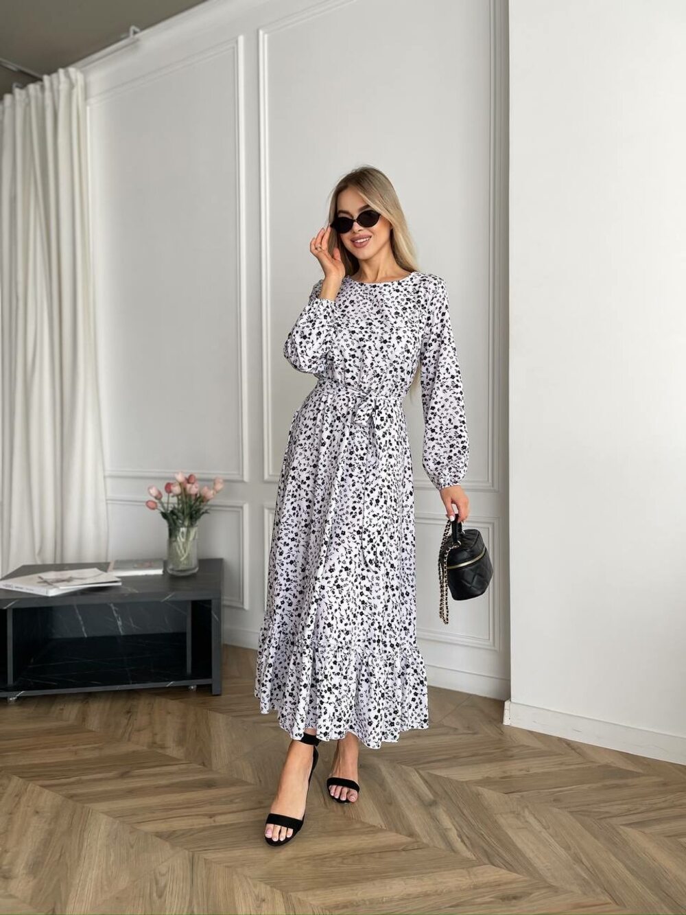 Сукня у ніжний квітковий принт з довгим рукавом та поясів у комплекті. Рукави та талія на резинці. Колір білий.