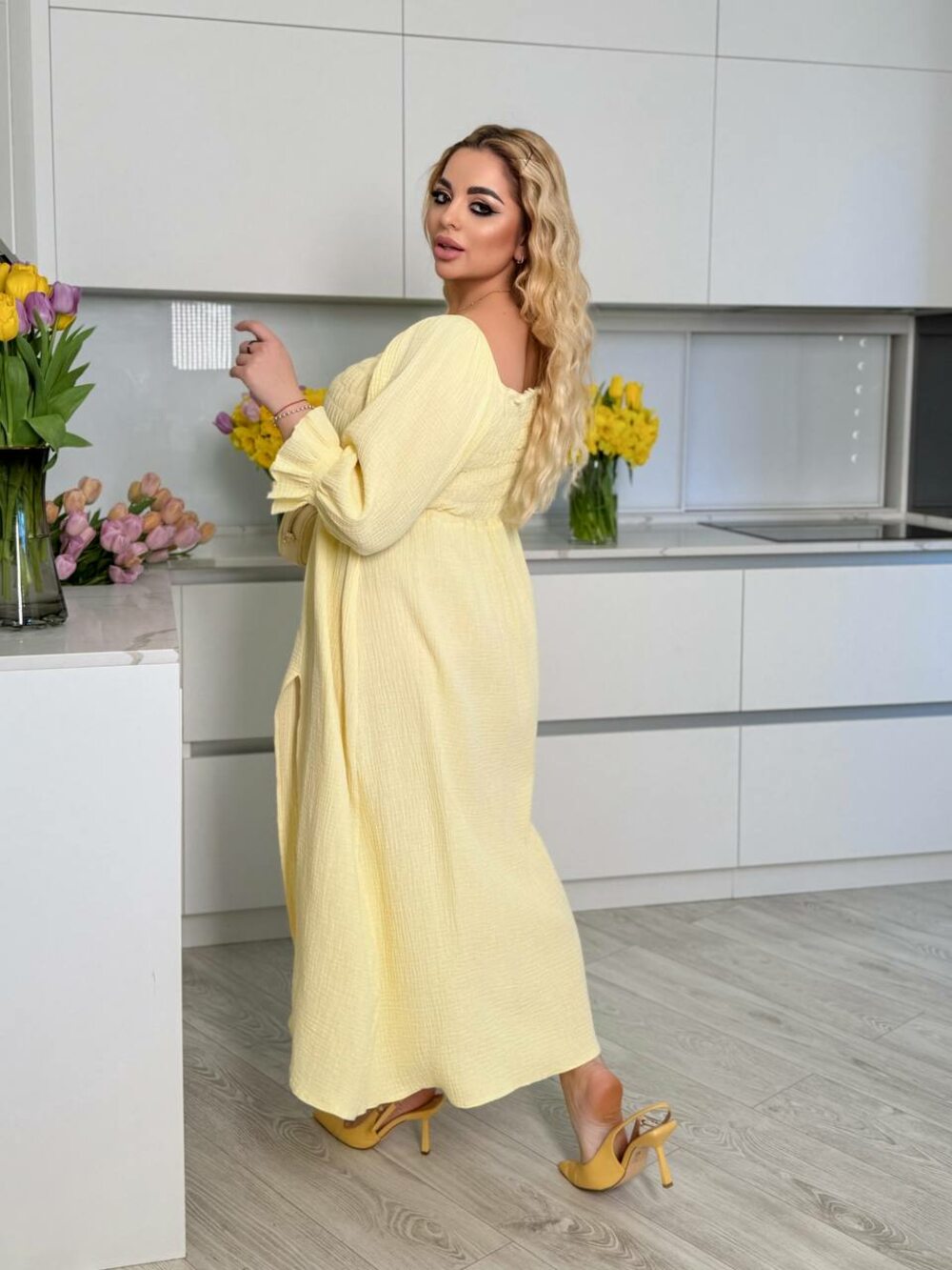 Сукня з гумкою, що тягне, і розрізом на нозі, об'ємні рукави додають легкості в образ. Колір жовтий.