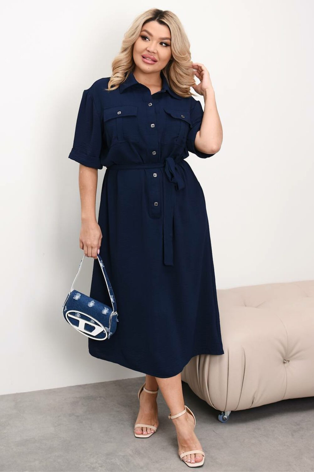 Стильна сукня на гудзиках з накладними кишенями та поясом. Є кишені з боків для зручності. Пояс знімний, можна носити без нього. Стильне та легке, підійде під різні образи. Тканина приємна до тіла. Колір синій.