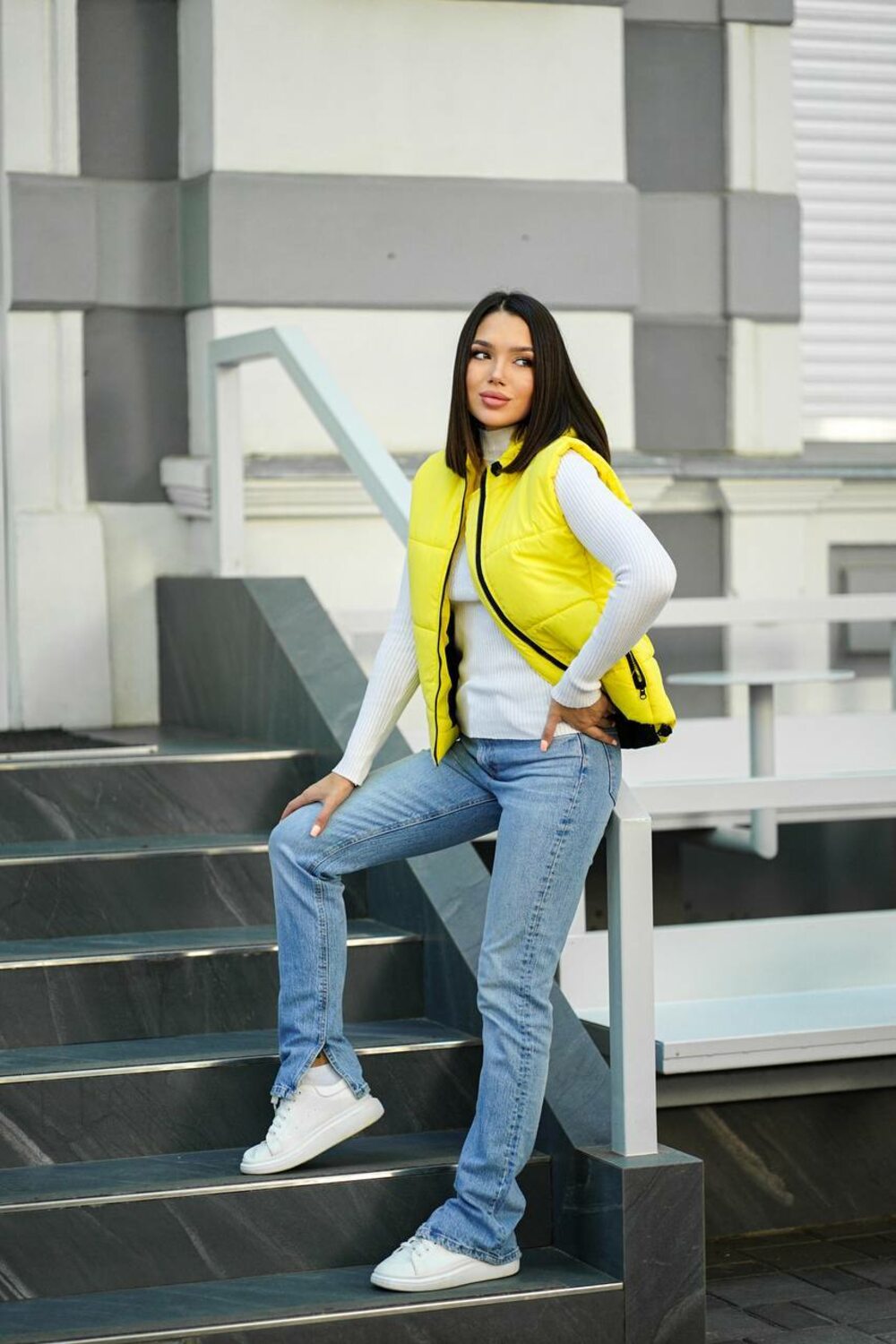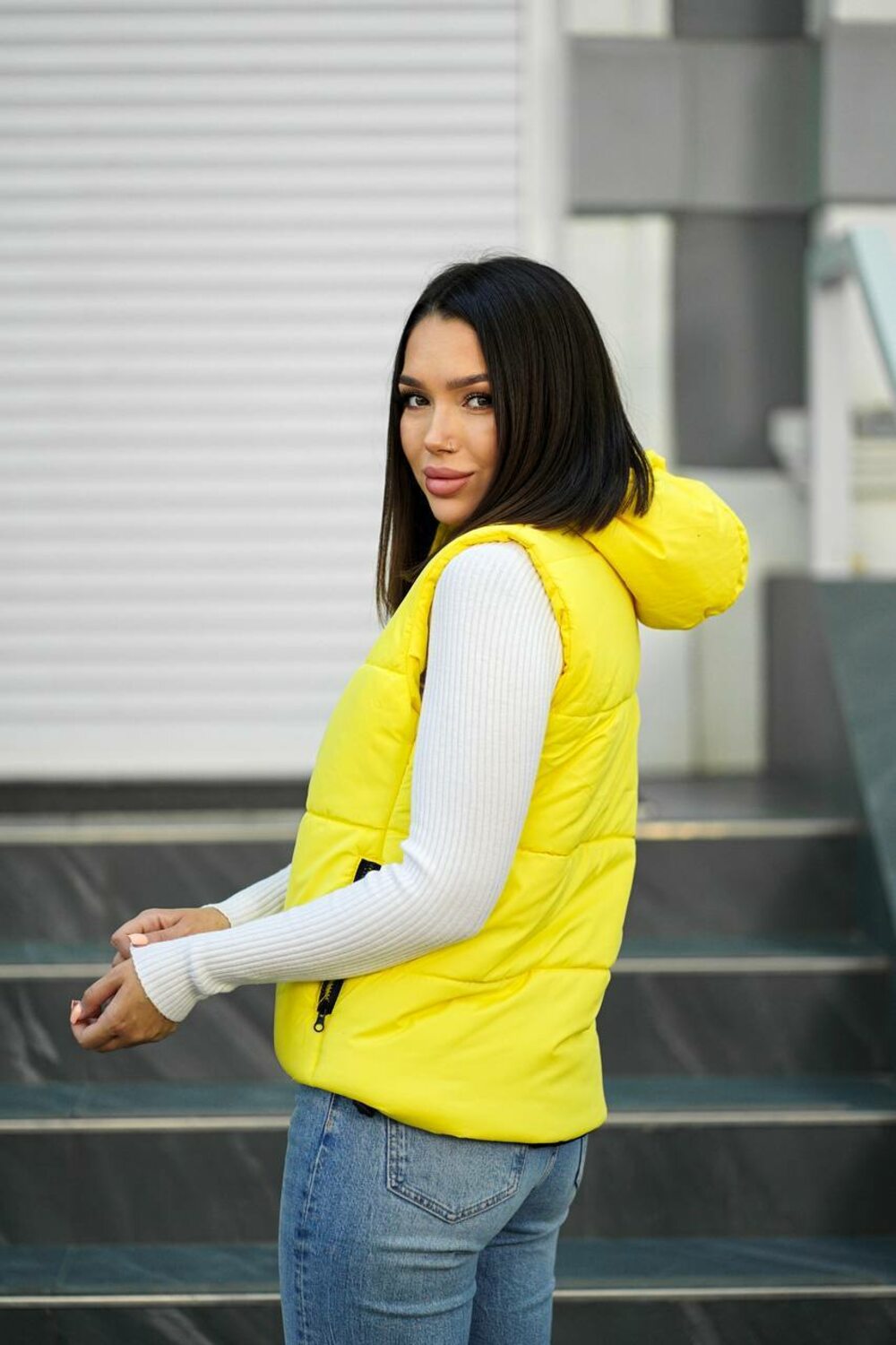 Утеплённая весенняя жилетка с капюшоном на молнии. Лёгкая, комфортная, хорошо держит форму, удобные карманы на молнии. Идеальна для прогулок и повседневных образов. Цвет: жёлтый.