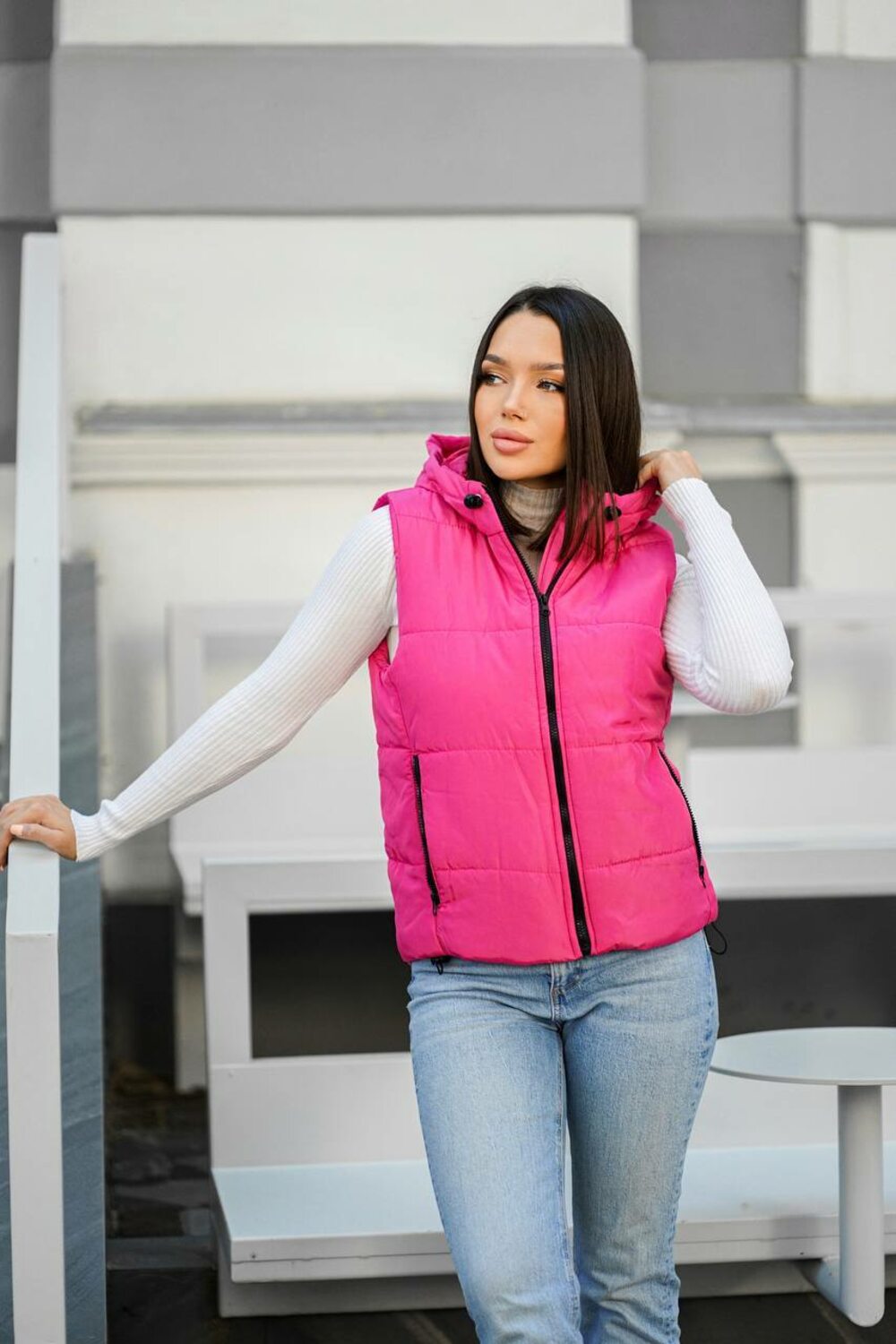 Утеплённая весенняя жилетка с капюшоном на молнии. Лёгкая, комфортная, хорошо держит форму, удобные карманы на молнии. Идеальна для прогулок и повседневных образов. Цвет: малиновый.